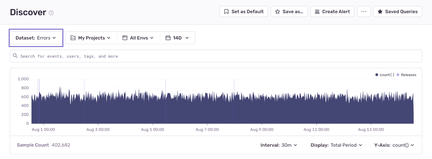3. Sentry monitors different types of events for errors and performance. To query issues, select the "Errors" dataset using the Dataset dropdown.