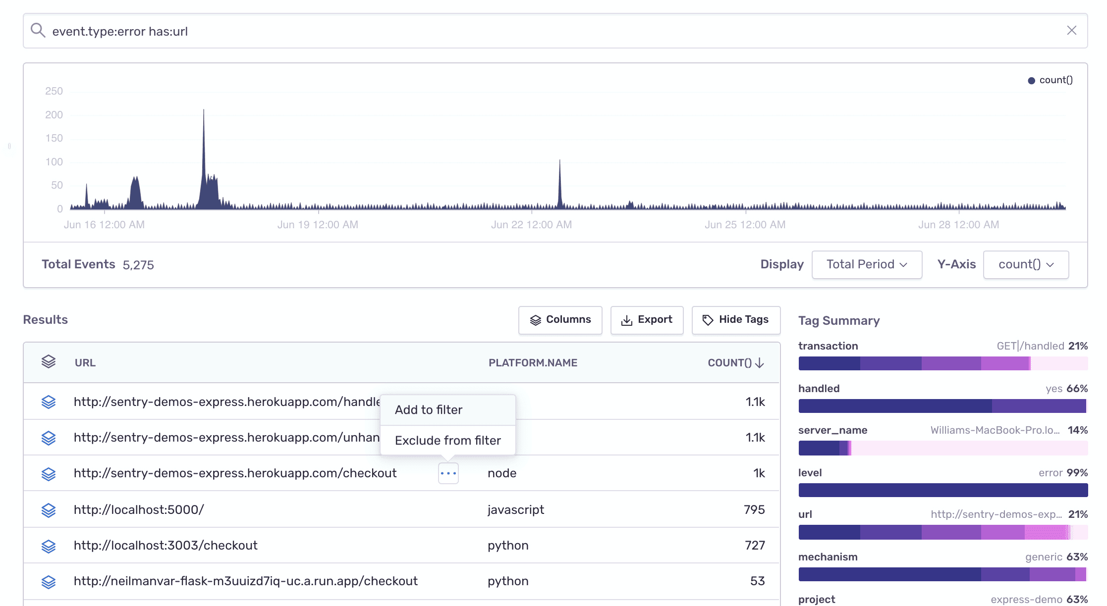 • Table columns: url, platform.name, count()