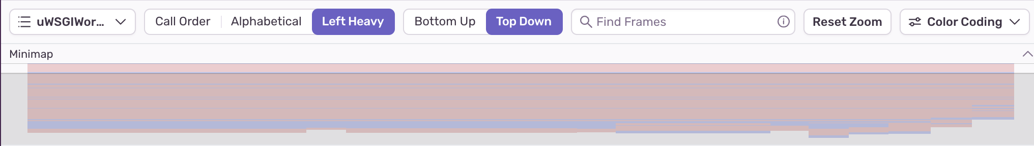 The “Transaction” section below the “Minimap” renders a tree of spans. It's the same view shown on the performance waterfall chart, but condensed to minimize white space. This view is helpful for cross-referencing profiler stack frames with span data.