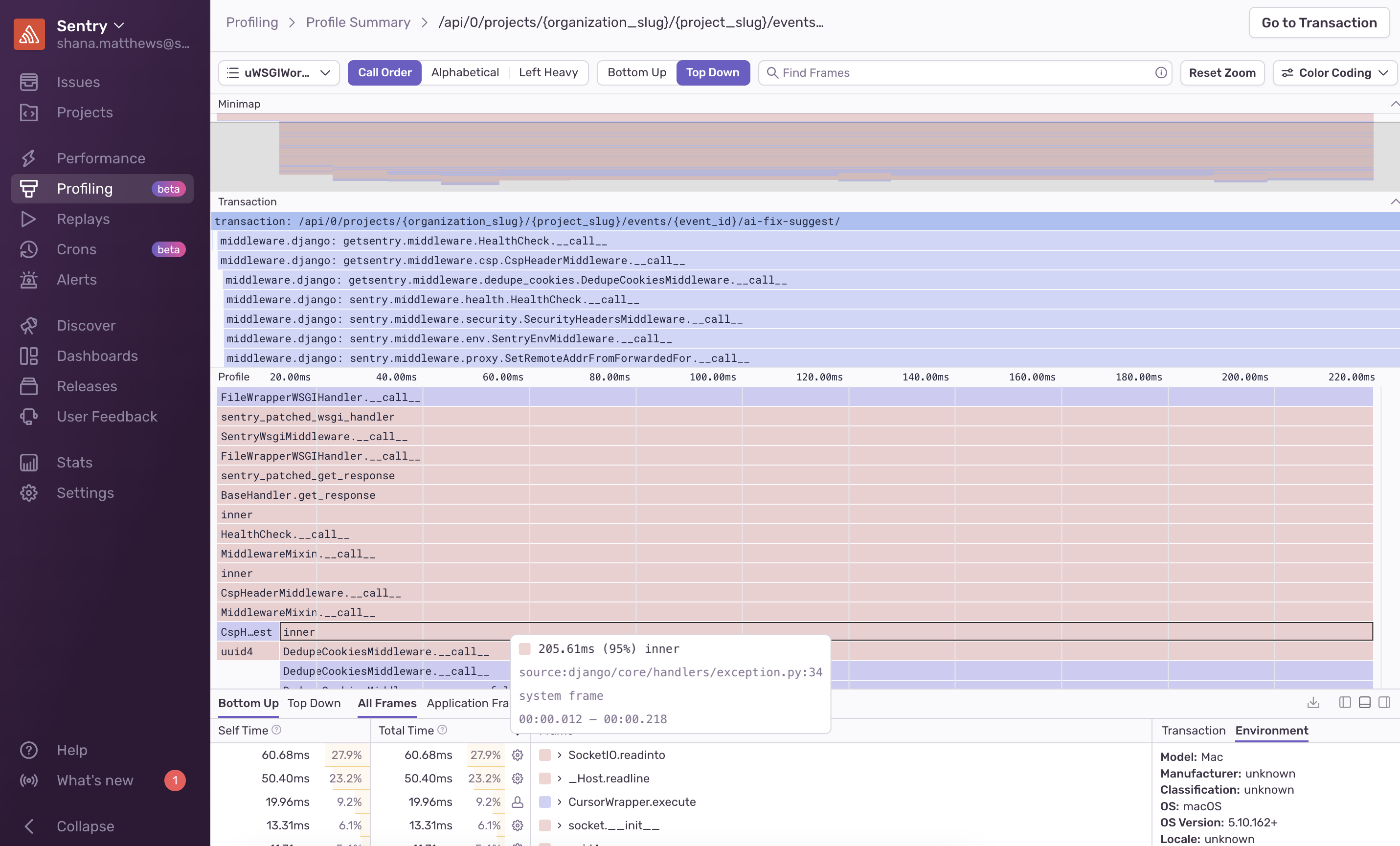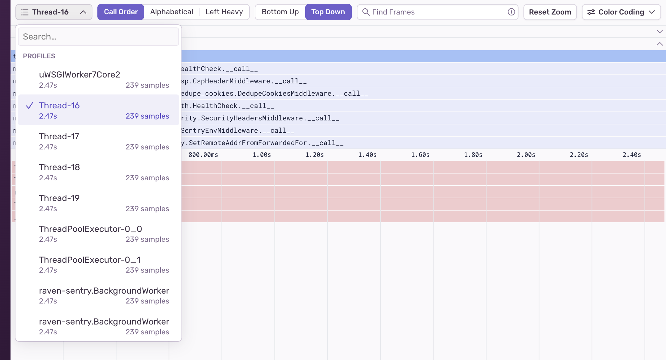 Profiling data can be used to gain insight into what methods and lines of your code are slow. Each profile has a detailed view that gives information about what happened in your code while the profile was collected and offers different ways to explore your profile data. This information can be found by going to the Profiling page in sentry.io, clicking on a “Transaction” and then selecting a “Profile ID.”